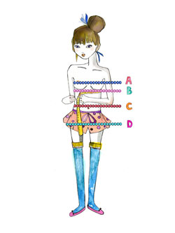 | Обхват бюста, см (A) | 85 | 90 | 96 | 102 |
